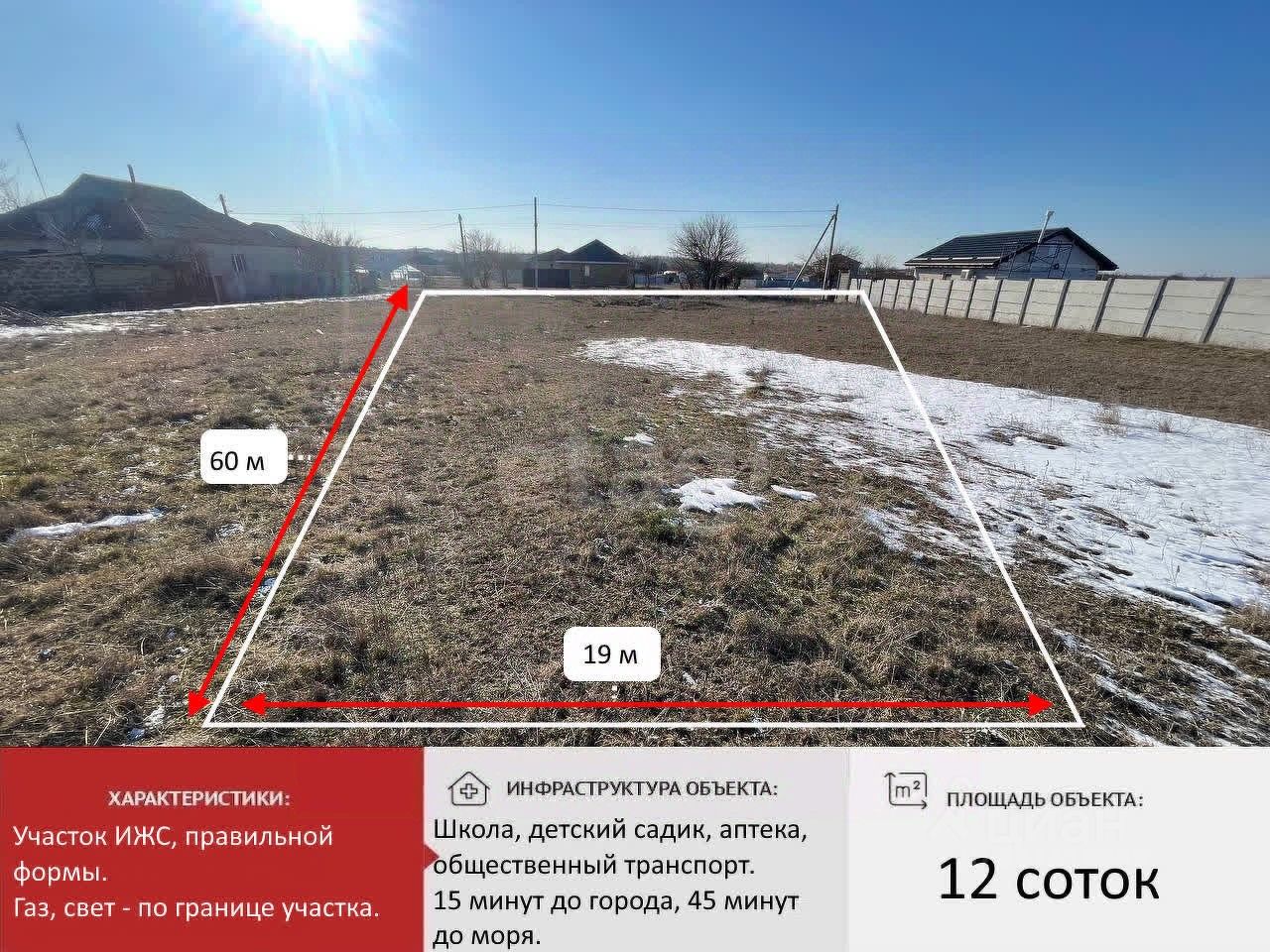 Участок ровный, правильной формы, 12 соток в селе Первомайское.
