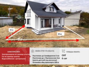 Участок ровный, все коммуникации по границе участка. Удобные подъездные пути. Автобусы ходят с интервалом в пятнадцать минут. До моря 50 км, до Симферополя 7км.
