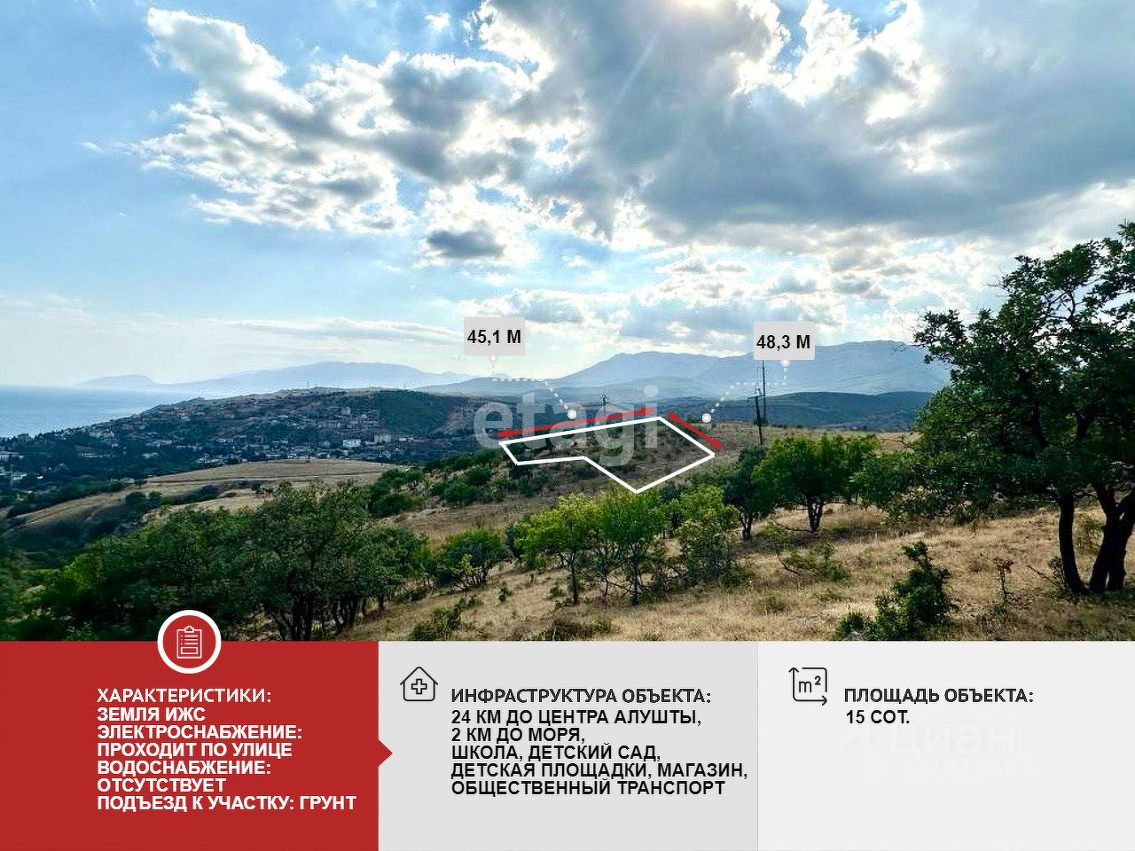 Продаётся великолепный участок ИЖС 15 сот. с потрясающим видом на окрестности. Идеальное место для строительства дома или гостиницы, всего в 10 минутах от морского побережья. Вас ждут чистый галечный пляж без волнорезов и завораживающие пейзажи.