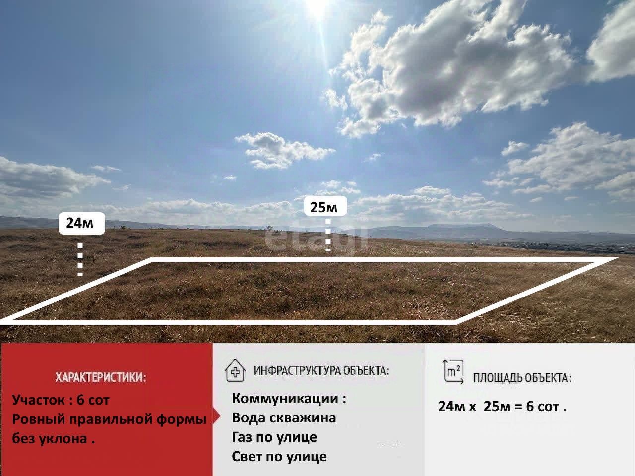 Ровный участок, правильной, прямоугольной формы. По границе участка проходят коммуникации: свет и газ. Есть возможность подключения.