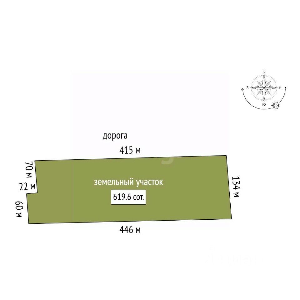Площадь земельного участка, 6.2 га. Участок выходят на две противоположные трассы.