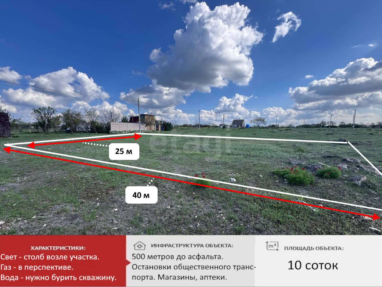 До асфальтированной дороги и остановки общественного транспорта 500 метров. Транспортная развязка в любое направление Крыма, магазины, аптеки, детские сады, школы в 10 минутах езды на автомобиле.