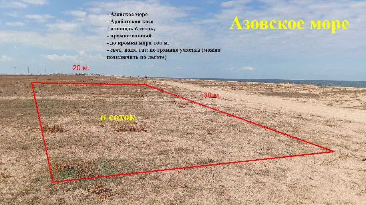 Продается уникальный участок площадью 6 соток в живописном селе Соляное, всего в 100 метрах от берегов ласкового Азовского моря! Это идеальное место для тех, кто ценит спокойствие и уединение вдали от шумных курортов. Участок имеет ровную прямоугольную форму и уже прошел межевание, что делает его готовым к строительству вашей мечты.