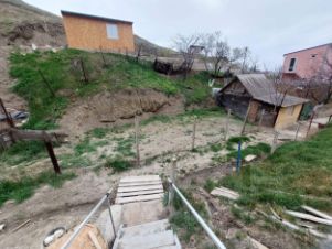 Дорога грунтовая, отсыпана. Участок чистый, сухой, внизу склоне, есть небольшой домик.