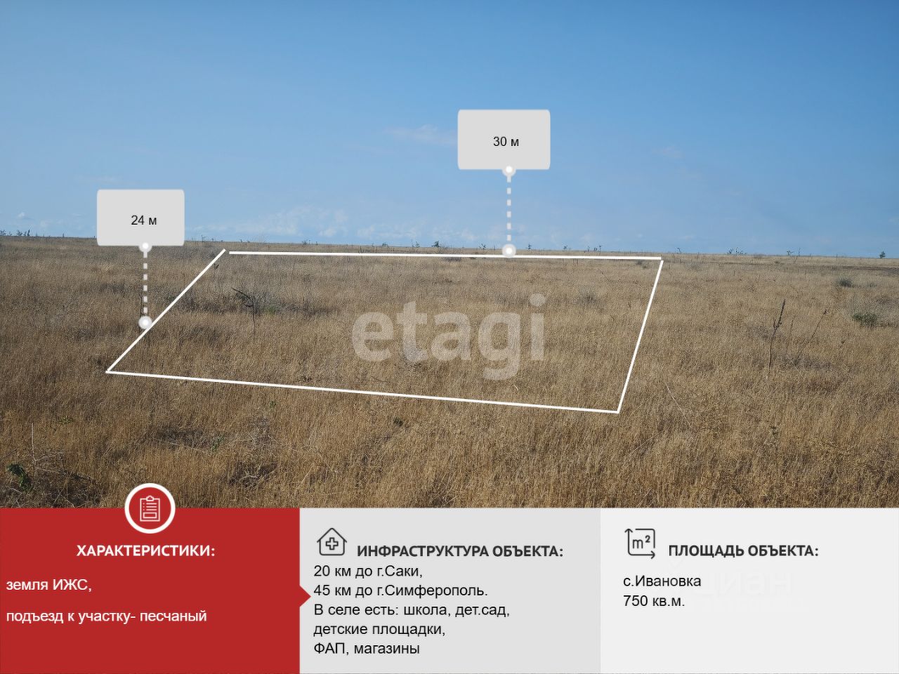 Участок под ИЖС площадью 7,5 соток расположен в перспективном сельском поселении Ивановка вблизи города Саки. Ключевым преимуществом является отличная транспортная доступность: участок находится недалеко от трассы Саки-Севастополь, что обеспечивает круглогодичную связь с ключевыми городами Крыма. До районного центра, города Саки, дорога займет около 20 минут, до Симферополя — 50 минут, а до морского побережья можно добраться в среднем за 20 минут.