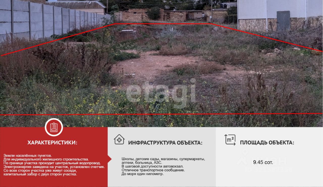 Продам участок площадью 9,45 соток недалеко от центра Черноморского. Вид разрешенного использования - Индивидуальное жилищное строительство.