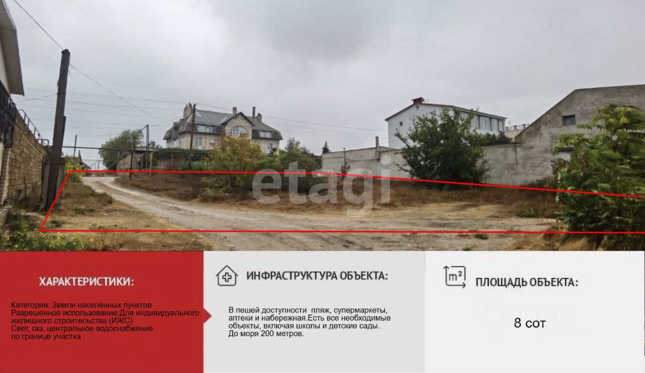 Продам перспективный участок на берегу моря в курортном поселке Черноморское площадью 8 соток. Вид разрешенного использования- ИЖС. Категория земель-земли населенных пунктов.