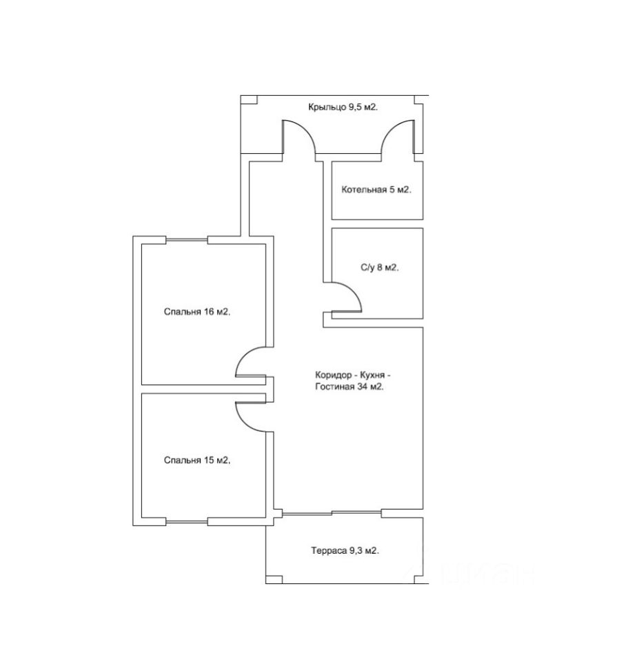- Коридор, Просторная кухня, Гостиная с выходом на террасу (34 м2)