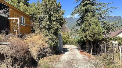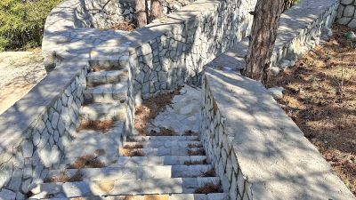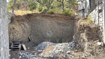 Участок прямоугольной формы с видом на горы и город. Установлены подпорные стены.