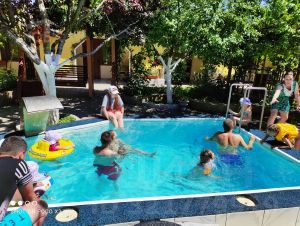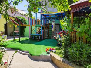Во дворе бассейн, беседки, детская площадка, зона отдыха, бильярд, мангал, номера для обслуживающего персонала. Территория озелененная, очень уютная , напоминает райский уголок.Полностью готовый бизнес.