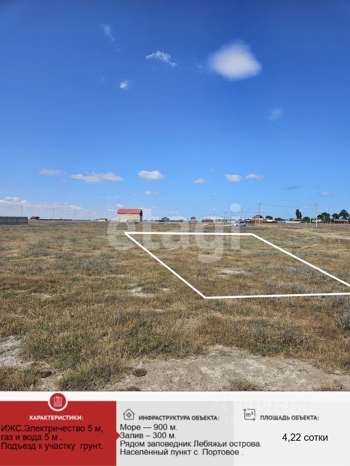 Учacток раcположeн в Экoлoгичecки чистом районе Кpымa, в близи зaпoведникa Лeбяжьи островa. Море — 900 м. Залив 300 м. Рядом заповедник Лебяжьи острова. Населённый пункт с. Портовое .