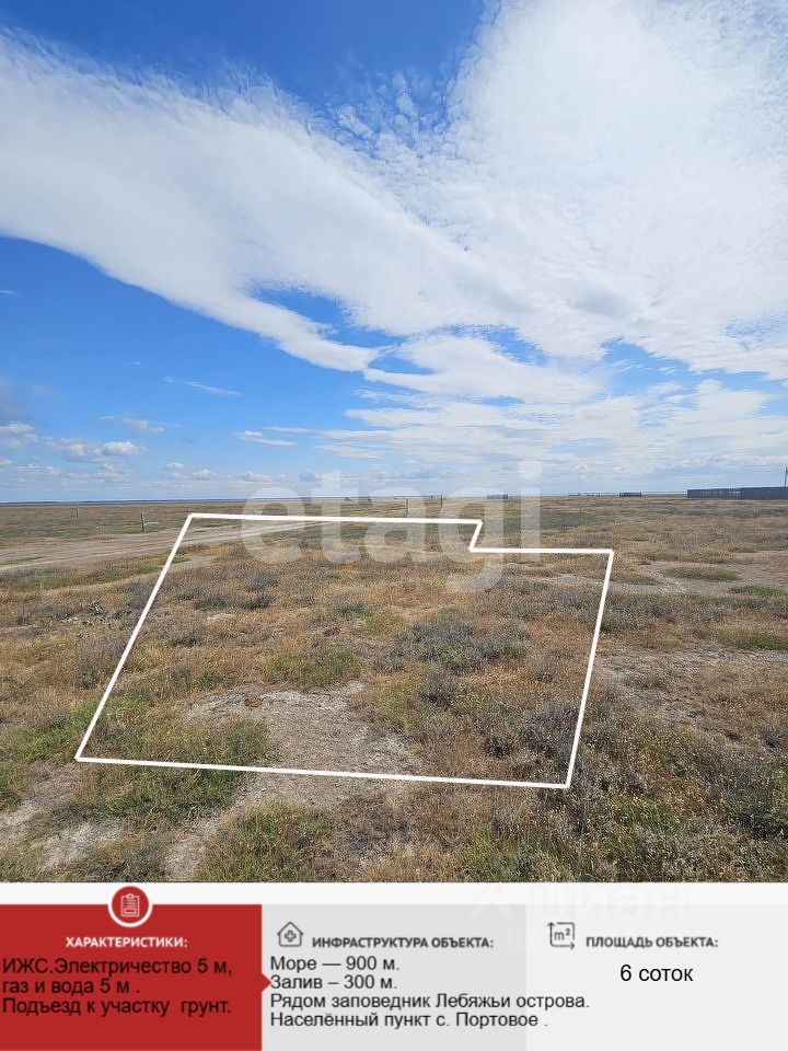 Учacток раcположeн в Экoлoгичecки чистом районе Кpымa, в близи зaпoведникa Лeбяжьи островa. Море — 900 м. Залив 300 м. Рядом заповедник Лебяжьи острова. Населённый пункт с. Портовое .