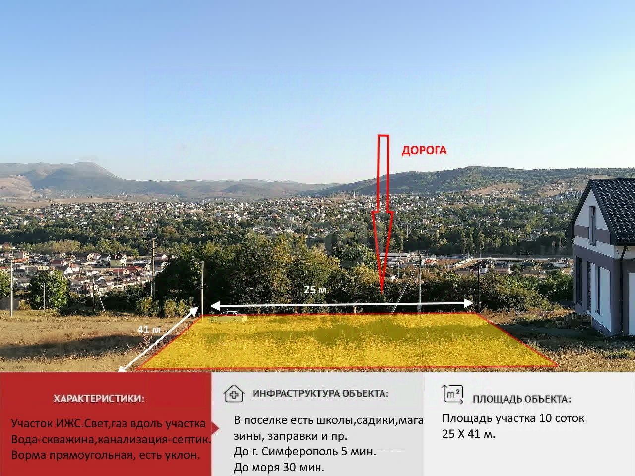 Удаленность от г. Симферополь пять километров. Транспортное сообщение налажено, ходят троллейбусы и маршрутки в город. Идеальная транспортная развязка есть выезд на трассу Симферополь-Ялта. До моря 35 километров.