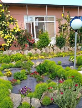 На ухоженном дворе расположен недостроенный дом площадью 42 кв.м. (крыша, стены и навес), который можно использовать по своему усмотрению. Двор радует глаз цветущими насаждениями и садом с плодовыми деревьями, создавая атмосферу уюта и спокойствия.