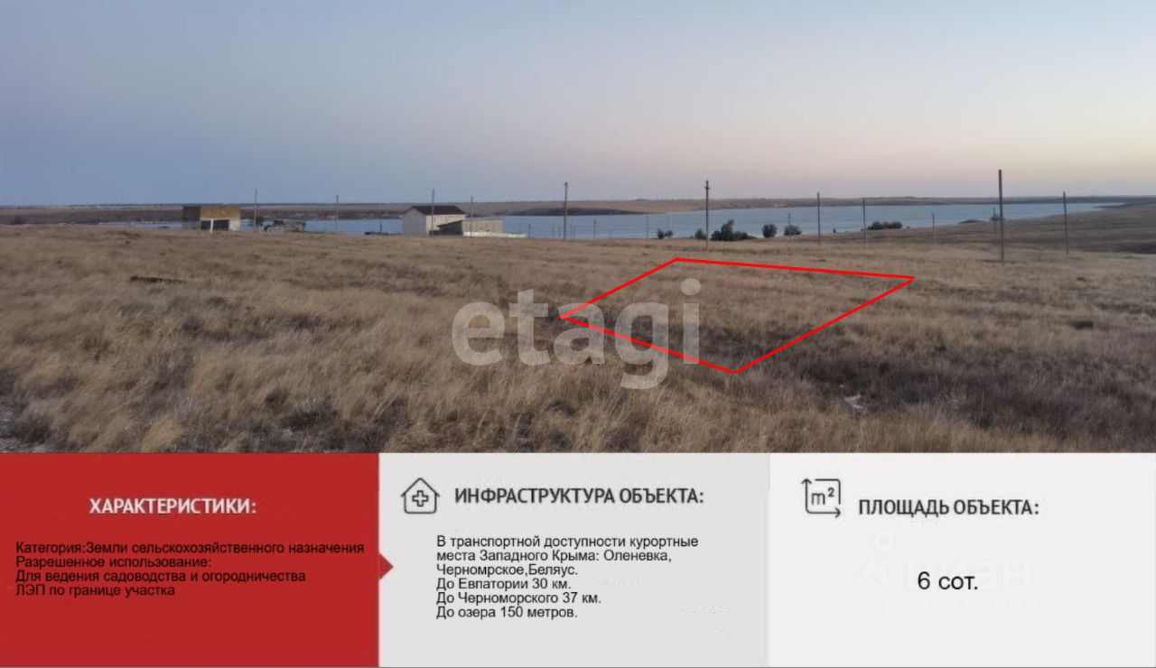 Продается участок площадью 6 соток в перспективном кооперативе "Звездный" на берегу залива Донузлав в Черноморском районе. Земли сельскохозяйственного назначения разрешены для ведения садоводства.