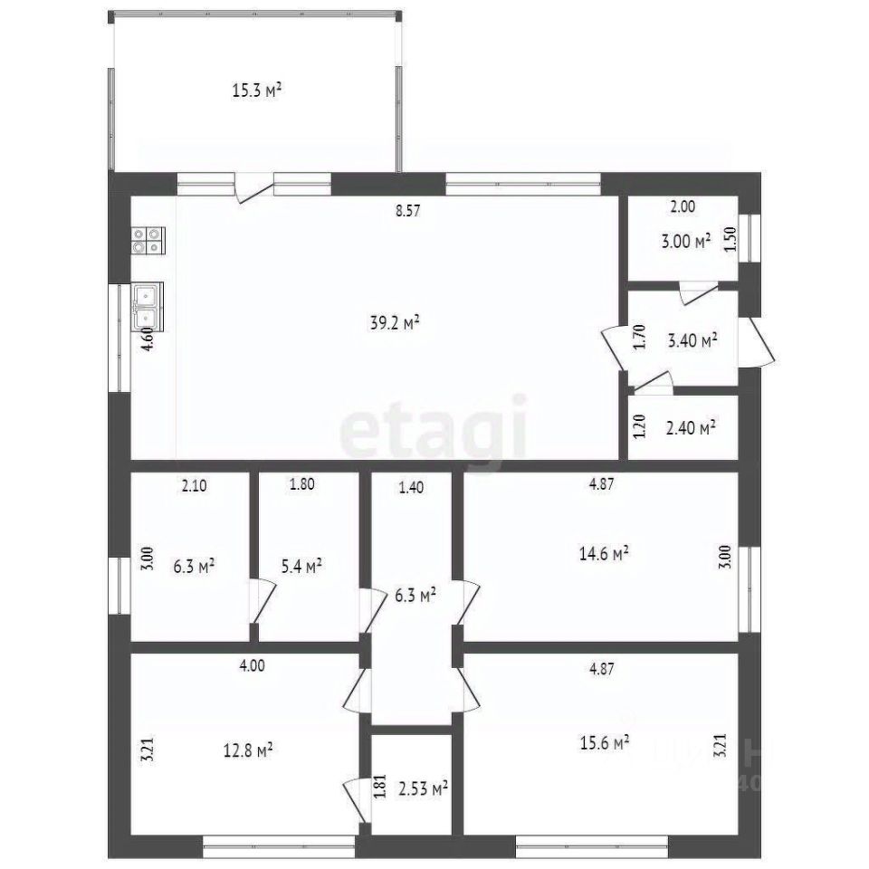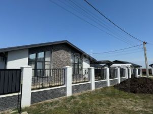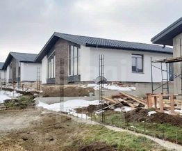 Одноэтажный дом 125.6 кв.м. расположен на земельном участке площадью 6 соток прямоугольной формы. Дом предлагается с предчистовой отделкой. В доме три комнаты (15.6 кв. м / 14.6 кв. м / 12.8 кв.м); кухня-гостиная (39.2 кв. м).