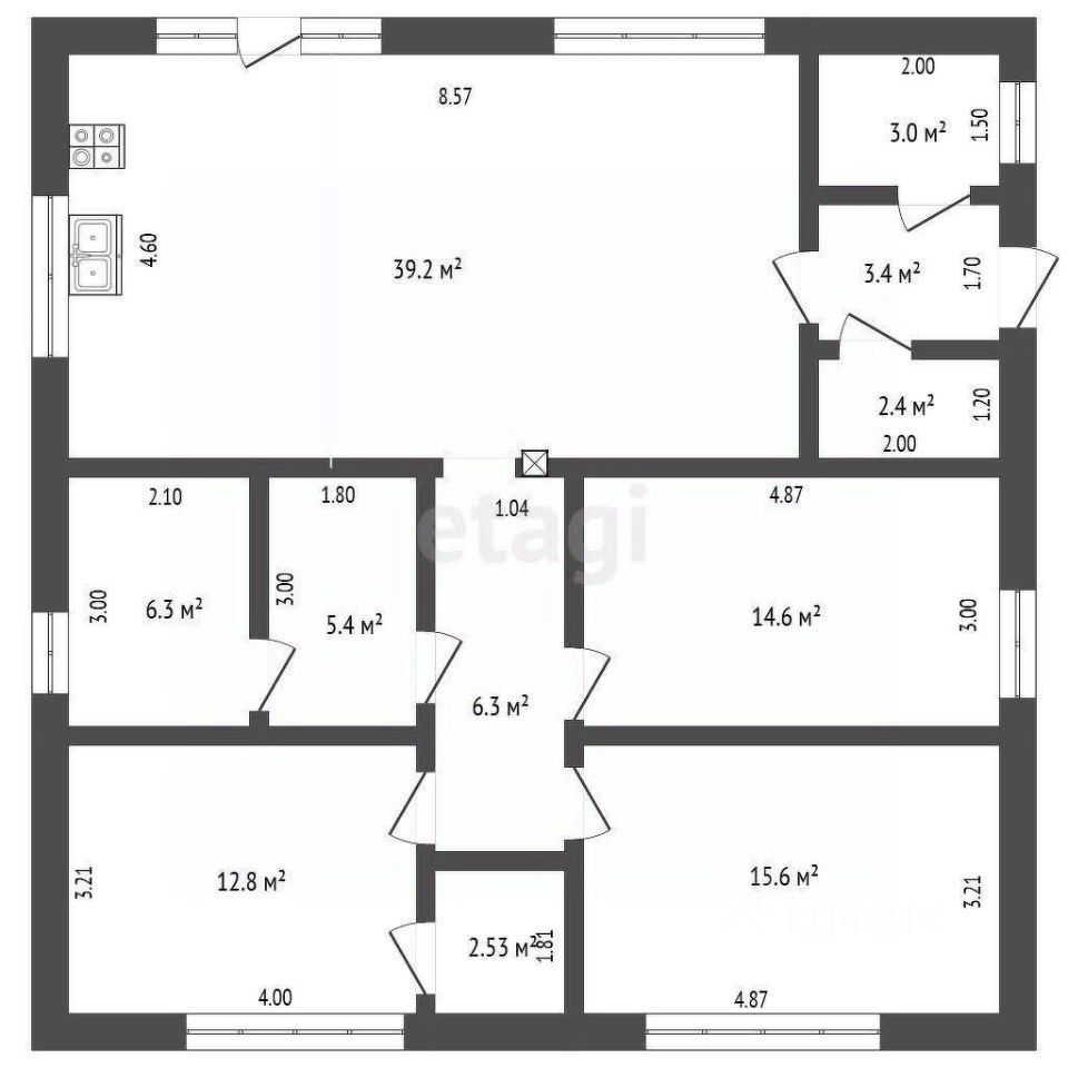 Одноэтажный дом площадью 125.6 кв.м. расположен на участке площадью 6 соток прямоугольной формы. Дом предлагается с предчистовой отделкой.