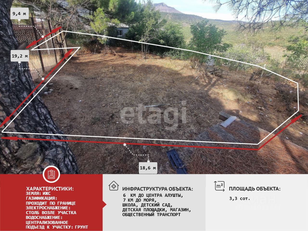 Инфраструктура и доступность: Участок расположен в развитом районе, с удобным круглогодичным подъездом. До ближайших магазинов, аптек и остановки общественного транспорта 1-2 минут. В город можно добраться как на машине, так и на маршрутке. В Алуште есть всё необходимое для жизни школы, детсады, поликлиники, рынки, ТЦ, пляжи, прогулочные зоны.