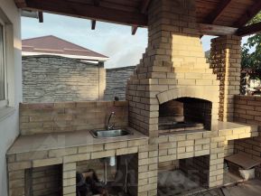 Мангал для шашлыков с обустроенной столешницей, раковиной и дровницей - полноценная летняя кухня.