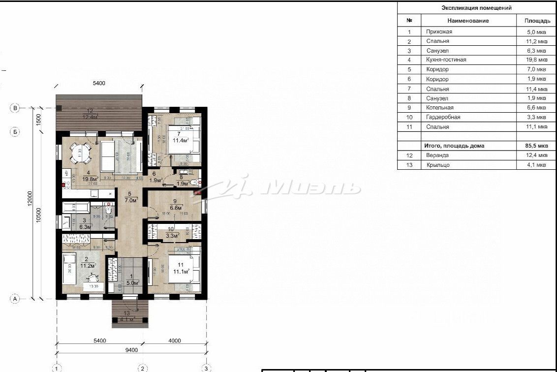 три спальни (11, 4 кв.м., 11.1 кв. м., 11.2 кв.м.), раздельный санузел, есть котельная, гардеробная.