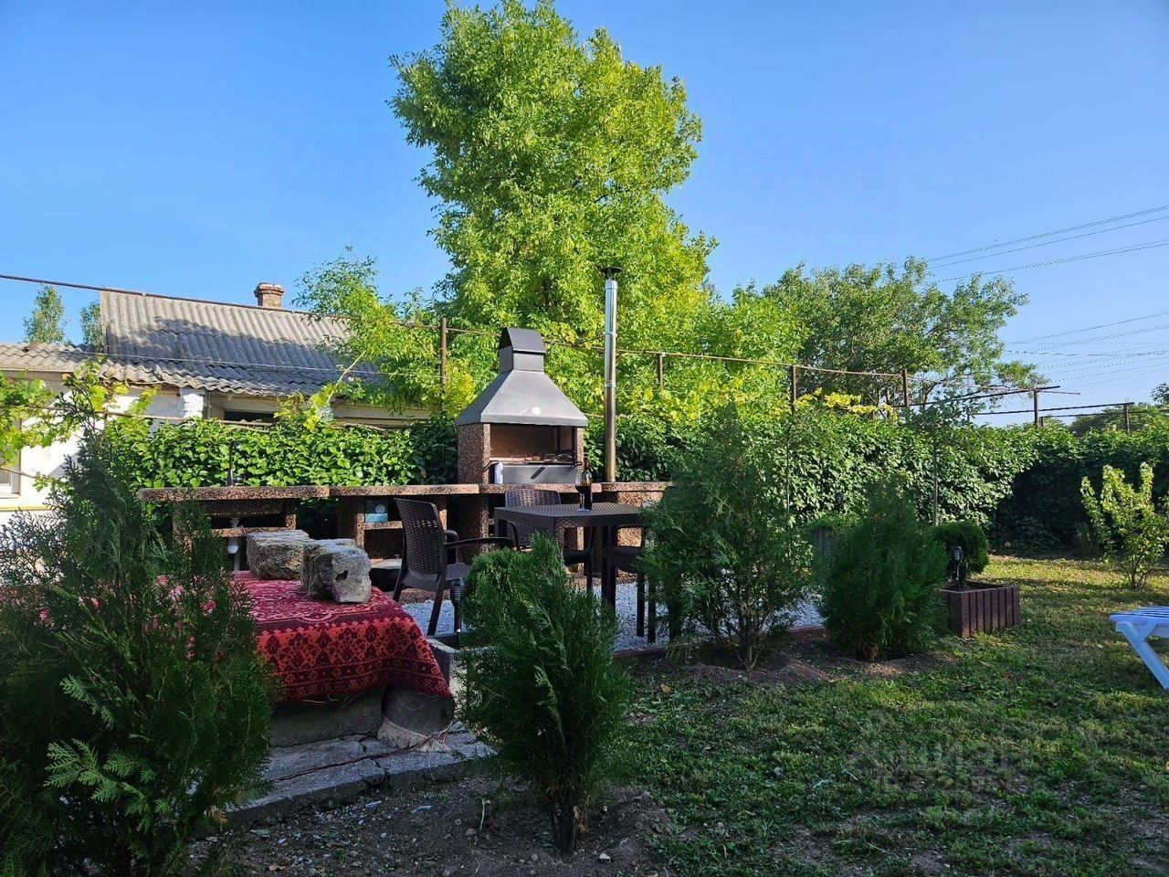 В доме проведён интернет и установлен ТВ Смарт. Территория вокруг дома большая, на ней есть всё необходимое для комфортного проживания: мангал с мангальными принадлежностями и казаном, посуда, постельное бельё и другие вещи.