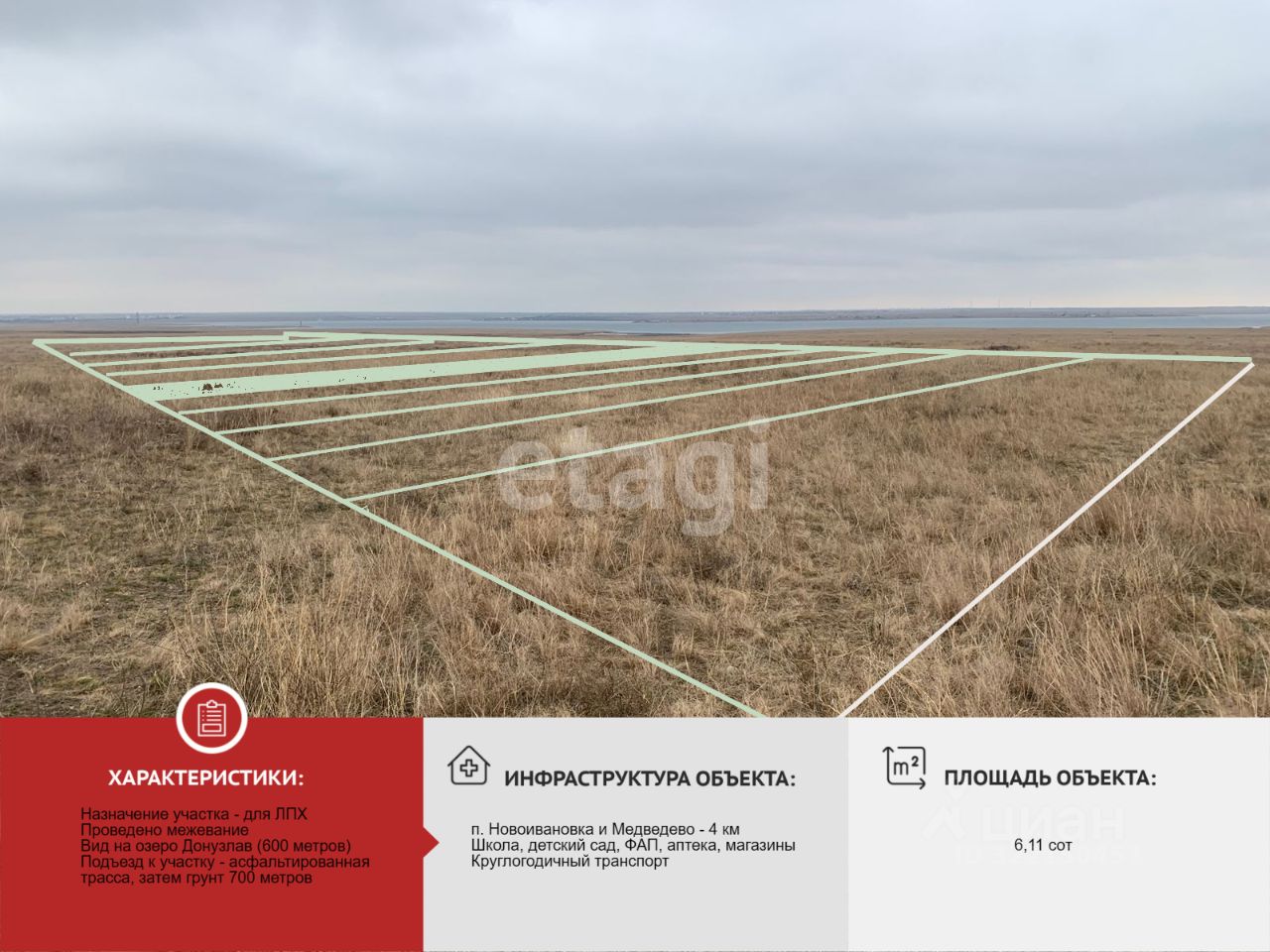 Участок ровный и слегка приподнятый, что обеспечивает потрясающий вид на озеро и его окрестности. На данный момент назначение земли — для личного подсобного хозяйства (ЛПХ), но согласно прогнозам, в ближайшие два года эти земли будут переведены в категорию рекреации, что значительно увеличит их стоимость. Это отличная возможность для тех, кто хочет вложить средства в перспективный объект!