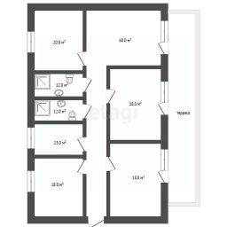 На текущий момент реализована просторная и функциональная одноэтажная планировка: четыре изолированные спальни, большая гостиная, объединенная с кухней-столовой, и два санузла.