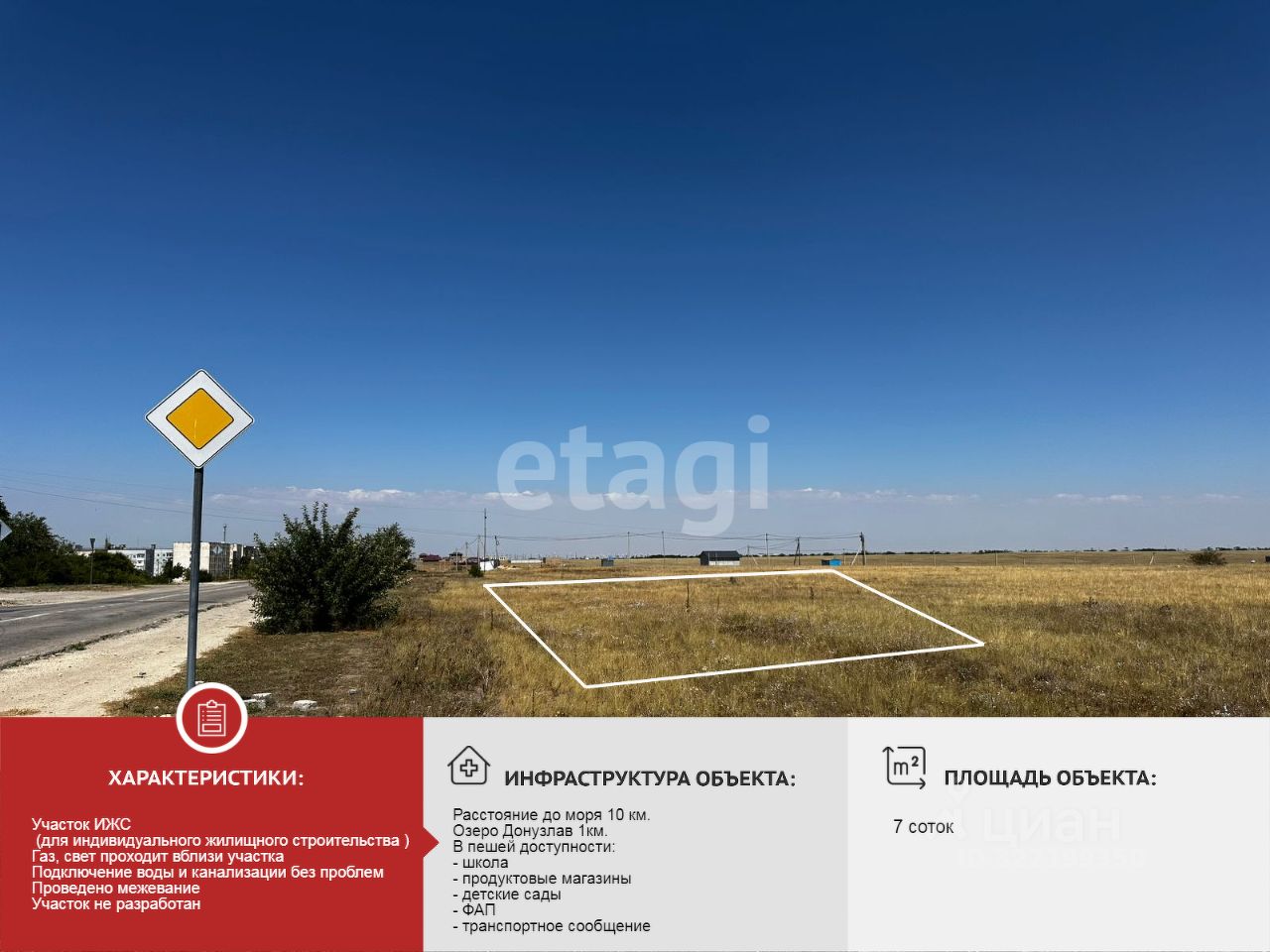 Участок расположенный в километре от побережья озера Донузлав. В границе села есть вся необходимая инфраструктура, такая как: детские сады, школа, детские развлекательные центры. Магазины, аптеки, ФАП, парки и рынок находится в пешей доступности. Транспортное сообщение круглогодичное.