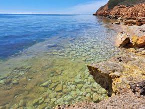 Высокий берег, спуски к морю есть песчаный пляж дикий.