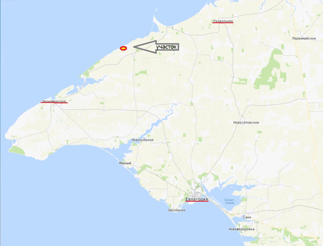 Участок находится на северо-востоке района, в степном Крыму, 3,5км от трассы (если ехать через Владимировку), 71км от .Евпатория и 114км от г.Симферополь.