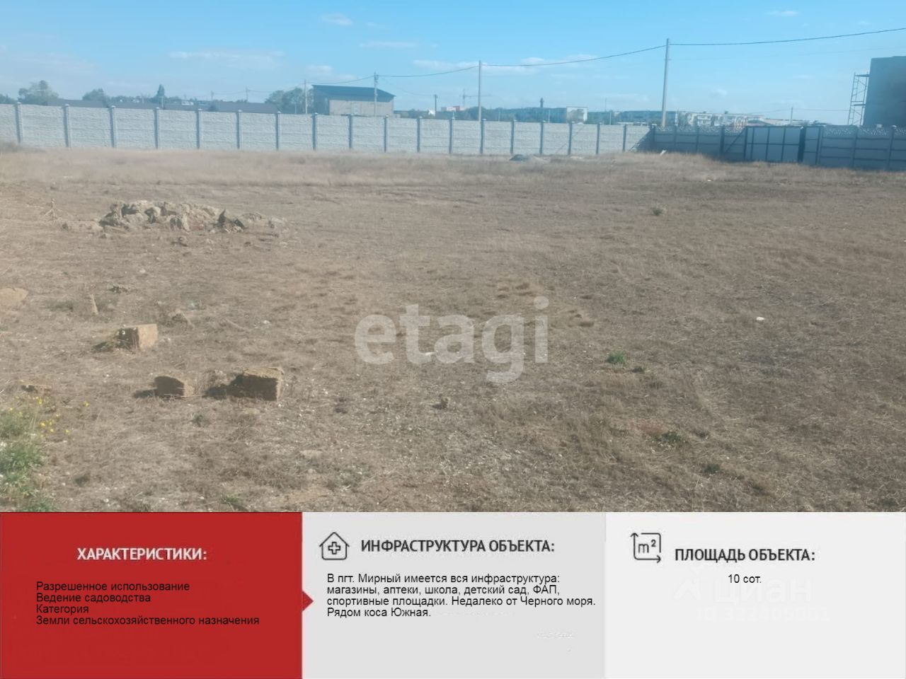 В пгт. Мирный имеется вся инфраструктура: магазины, аптеки, школа, детский сад, ФАП, спортивные площадки. Недалеко от Черного моря. Рядом коса Южная. Море в этих местах входит в ТОП мест Крыма с самой чистой и прозрачной водой и белым песком. Прекрасное место для курортного бизнеса или коттеджа для летнего отдыха и не только. Экологически чистое место Западного Крыма. Идеальный, лечебный морской, степной климат.