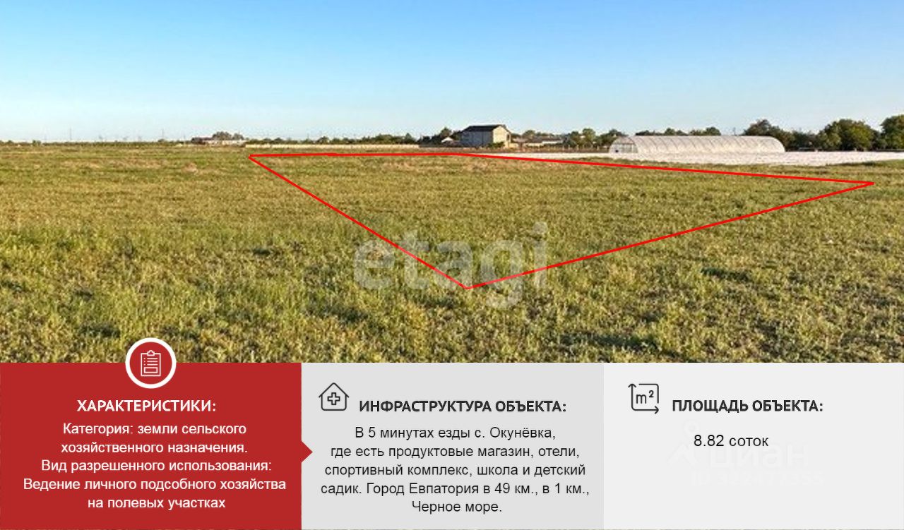 В 5 минутах езды с. Окунёвка, где есть продуктовые магазин, отели, спортивный комплекс, школа и детский садик. Город Евпатория в 49 км., в 1 км. Черное море.