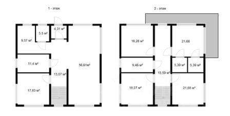 Общая площадь домовладения 268,8 кв.м., этажей - 2, жилых комнат - 5 (21,68+21,68+18,28+18,27+17,83 кв.м. соответственно каждая), кухня - гостиная 56 кв.м..