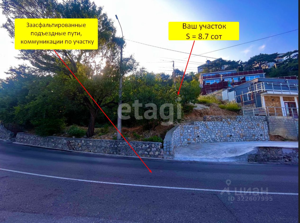 Участок с уклоном. Заасфальтированные подъездные пути, коммуникации по участку. Быстрый выезд на трассу, пару минут на машине и Вы в центре Алупки.