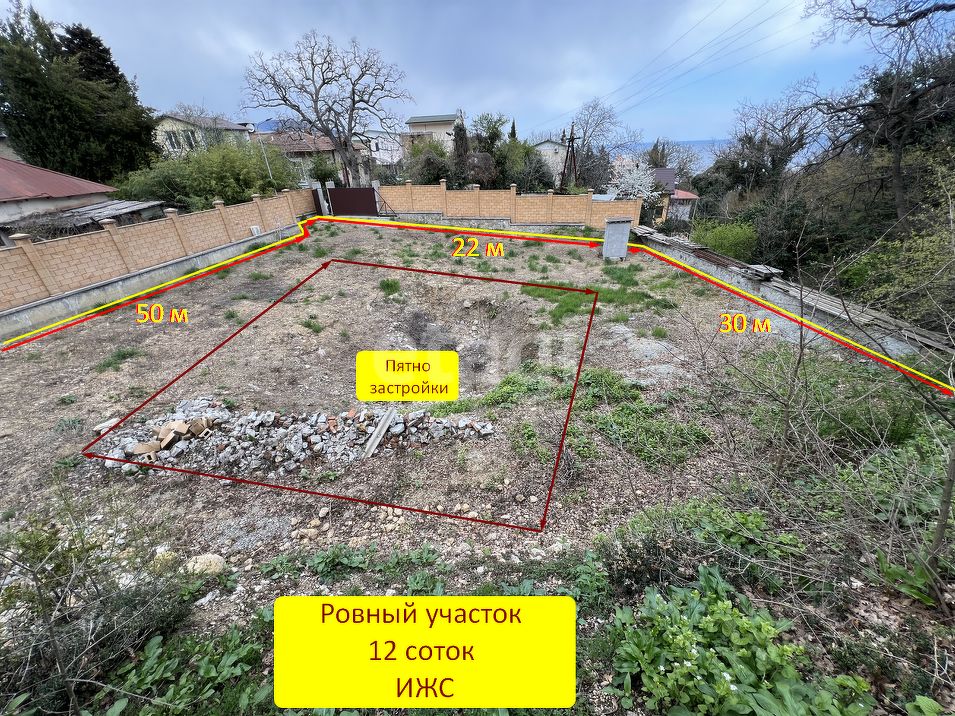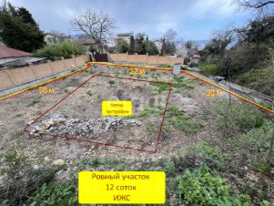 Продаётся земельный участок в городе Ялта пос. Даниловка, расположенный на 1 жилой линии. Участок площадью 12 соток, ИЖС. На участок заведены вода, канализация, электричество 15 киловатт, газ по границе участка. Территория участка огорожена капитальным забором. Участок ровный, правильной формы. Со второго этажа будущего дома будут открываться виды на море и горы. Через парковую зону санатория 5 минут ходьбы до пляжей, так же с территории участка удобный выезд на шоссе.