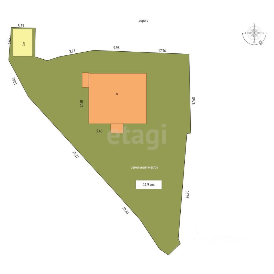 Коттедж представляет собой двухэтажное здание с цокольным этажом, фактически три этажа. Дом постройки 2004 года. В цокольном этаже размещается просторный холл, гостевая комната, котельная, туалет, ванная комната, сауна, кладовая. На первом этаже - кухня, столовая, гостиная, туалет, постирочная, гардероб. На втором этаже - две спальни, кабинет, ванная комната.