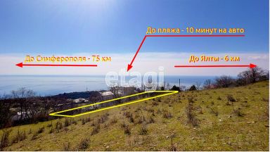 Продается земельный участок общей площадью 7 соток в пгт Никита с уклоном в сторону моря. Вид с участка - море и горы. Массив, где расположен участок активно развивается и строится. Назначение земли: ИЖС. Коммуникации: газ в 50 метрах, столб электричества на границе участка, вода рядом. Участок находится выше трассы, подъездные пути 50% асфальт, 50% грунт. В 5 минутах школа, магазины, аптека и пр. До Ялты 6 км, до Симферополя 75 км. По соседству с участком - дружелюбные соседи, экологическая зона и заповедник, невероятной красоты морская гладь и горные хребты. Звоните!