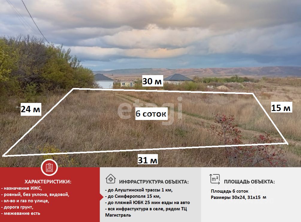 Расстояние до Симферополя 15 км, до пляжей южного берега 30 км.