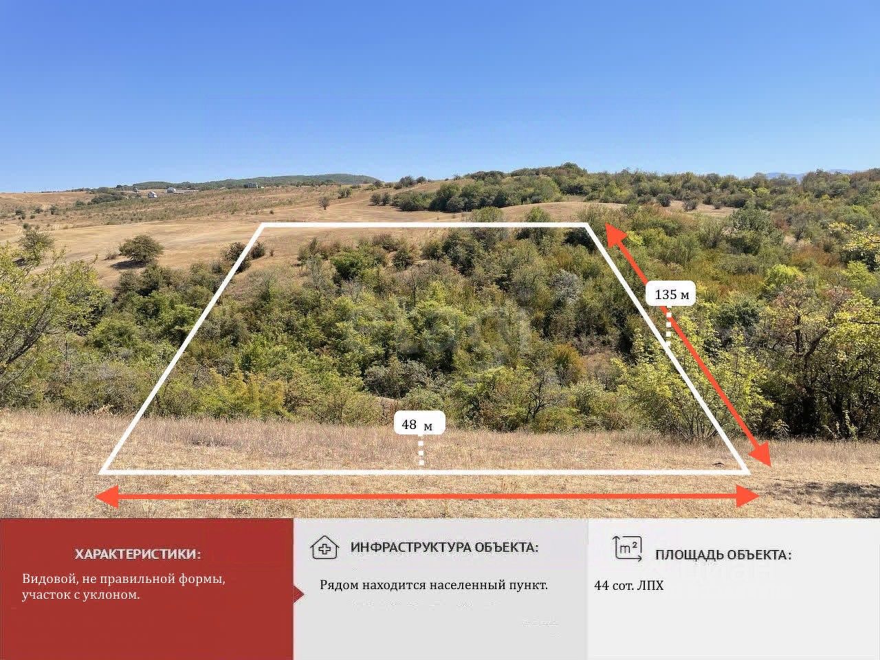 Участок находится на небольшом склоне с потрясающими видовыми характеристиками — идеален для создания террас, уютного дома и зон отдыха среди природы.