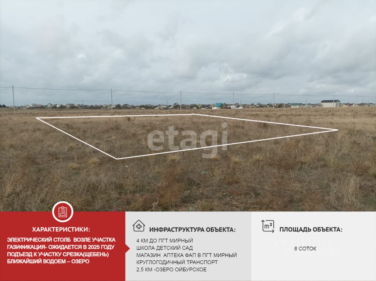 Всего в 2500 метрах от участка находятся дикие пляжи, а до оборудованных пляжей села Поповка всего 4 км. В окрестностях есть вся необходимая инфраструктура: в пгт. Мирный вы найдете школу, детский сад, кафе, магазины и пункты выдачи. В самом селе есть магазин, а остановка общественного транспорта расположена всего в 10 минутах пешком.