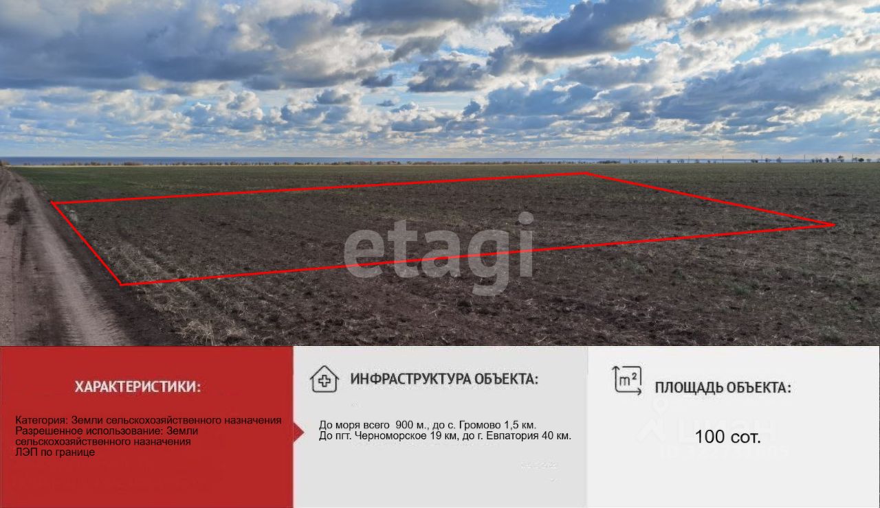 Участок правильной прямоугольной формы, размеры 100 на 100 метров. Линия ЛЕП проходит по границе участка. Дорога до участка грунтовая. Участок обработан, засеивался яровыми культурами. С участка открывается великолепный вид на море, что добавляет особую привлекательность этому месту.