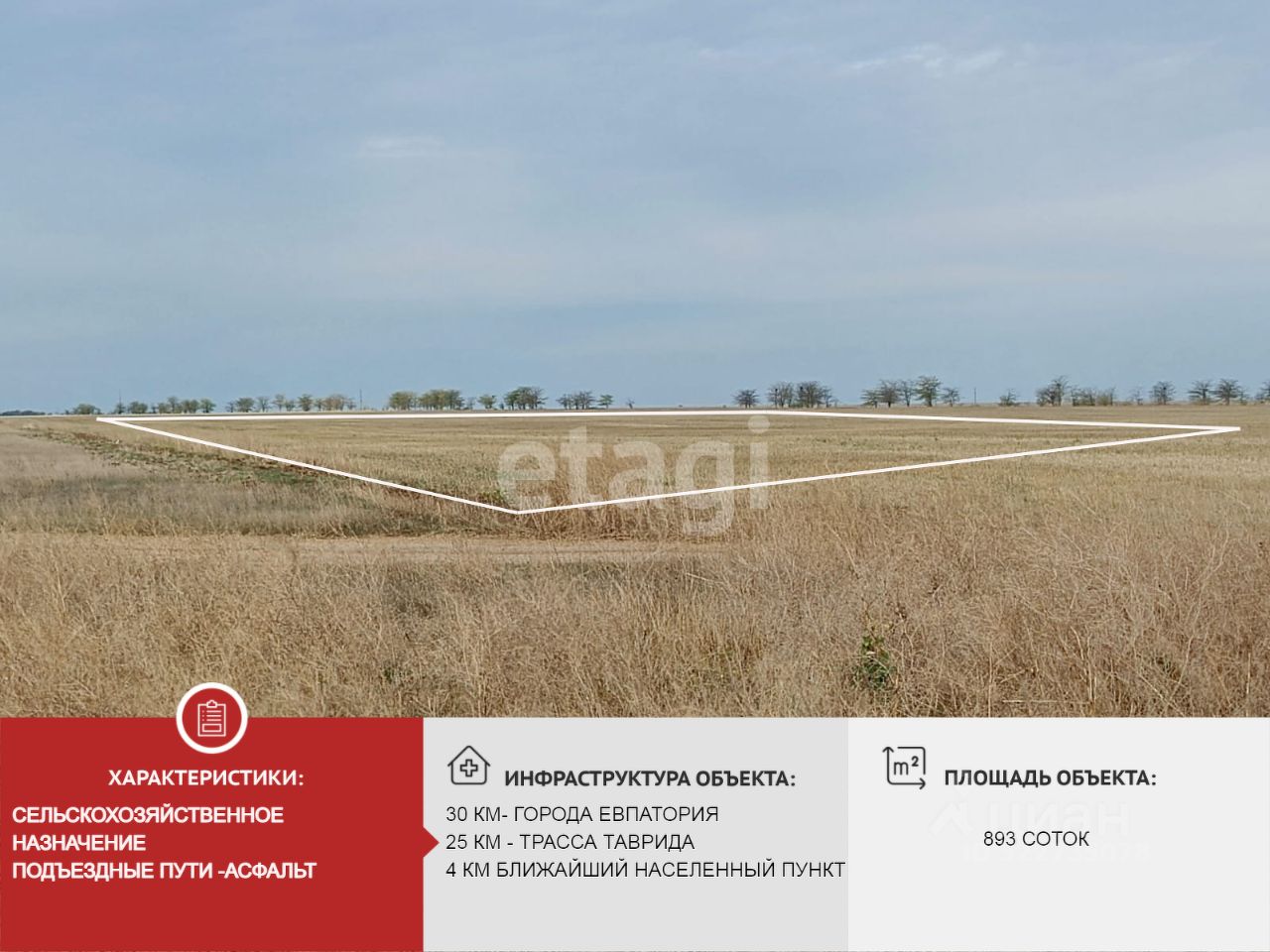 Участок ровный, прямоугольной формы, перепадов не имеет.Очень удобные подъездные пути. Подходит под выращивание различных сельскохозяйственных культур: от зерновых и виноградников до бахчевых.