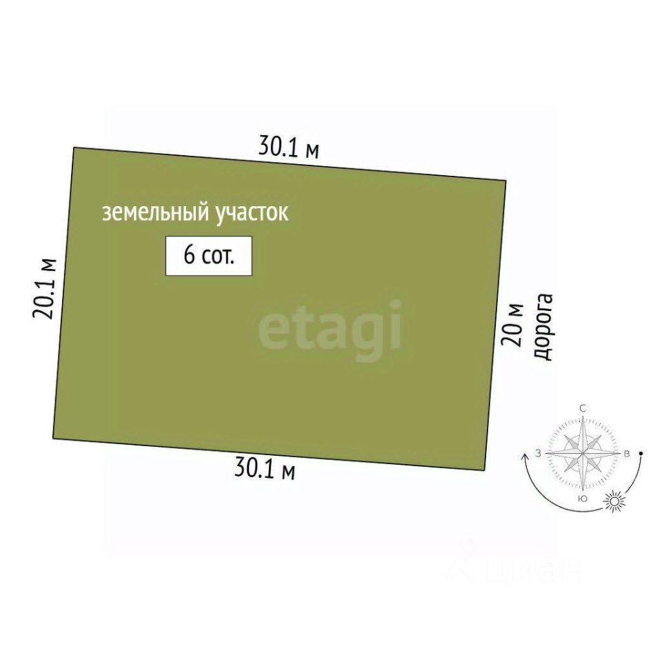 Площадь: 0.06 га (20х30 м), прямоугольная форма, угловое расположение в центре СНТ. Участок полностью отмежёван, границы подтверждены геодезией. Никаких проблем с подтоплениями — даже в ливни территория остаётся сухой!