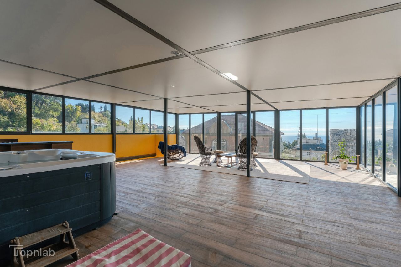 Главная особенность — застеклённая мансарда с джакузи и панорамным видом на море и горы. Пространство идеально спроектировано для комфорта и уединения.