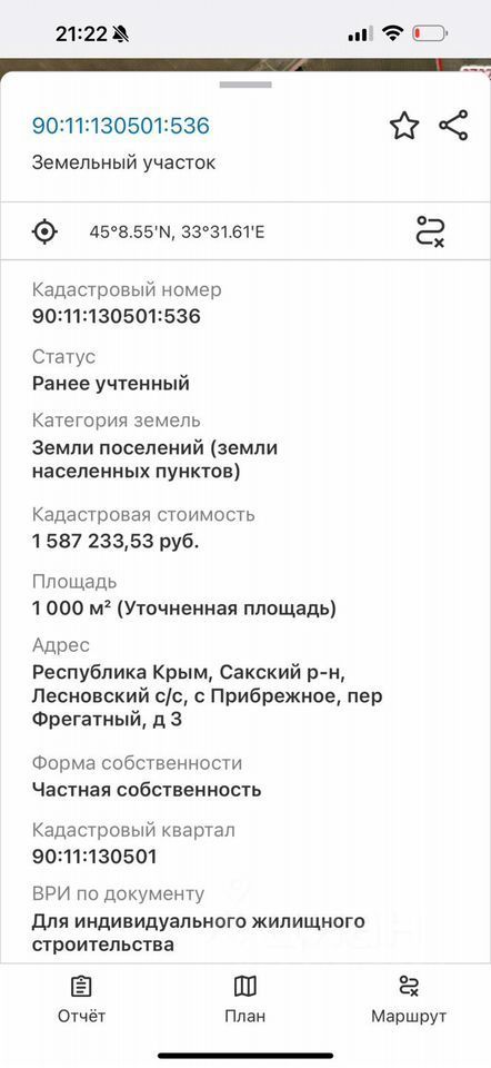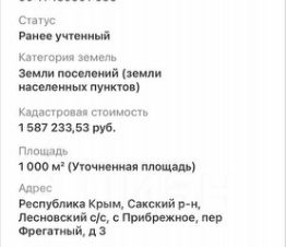 Земельный участок Республика Крым, Сакский р-н, Лесновский с/с, с Прибрежное, пер Фрегатный, д 3, кадастровый номер 90:11:130501:536
