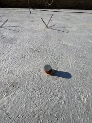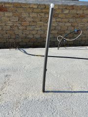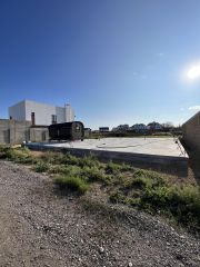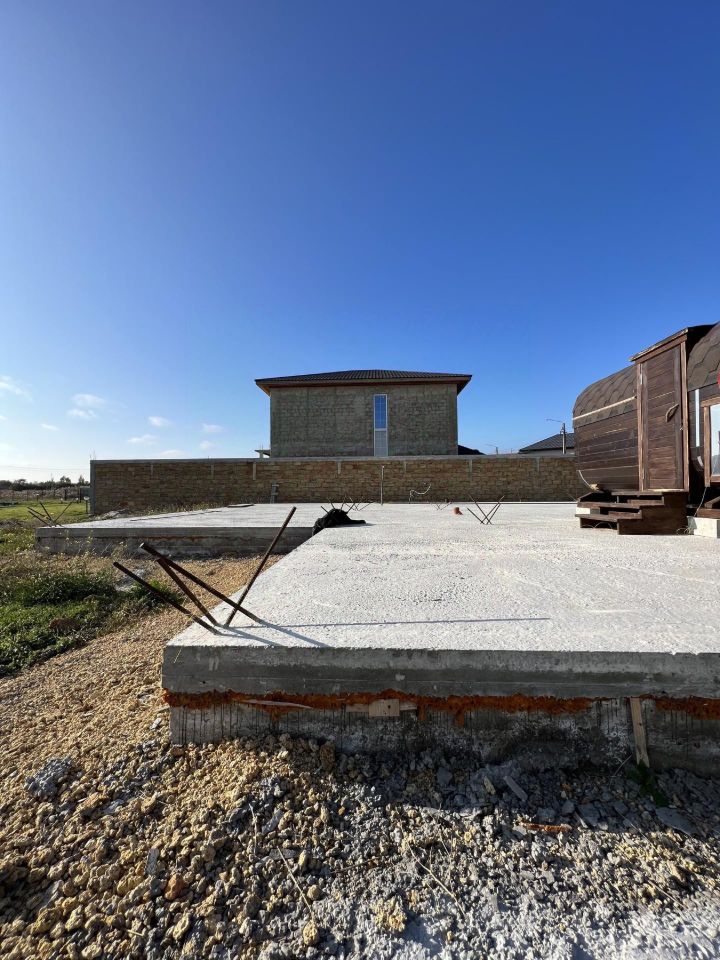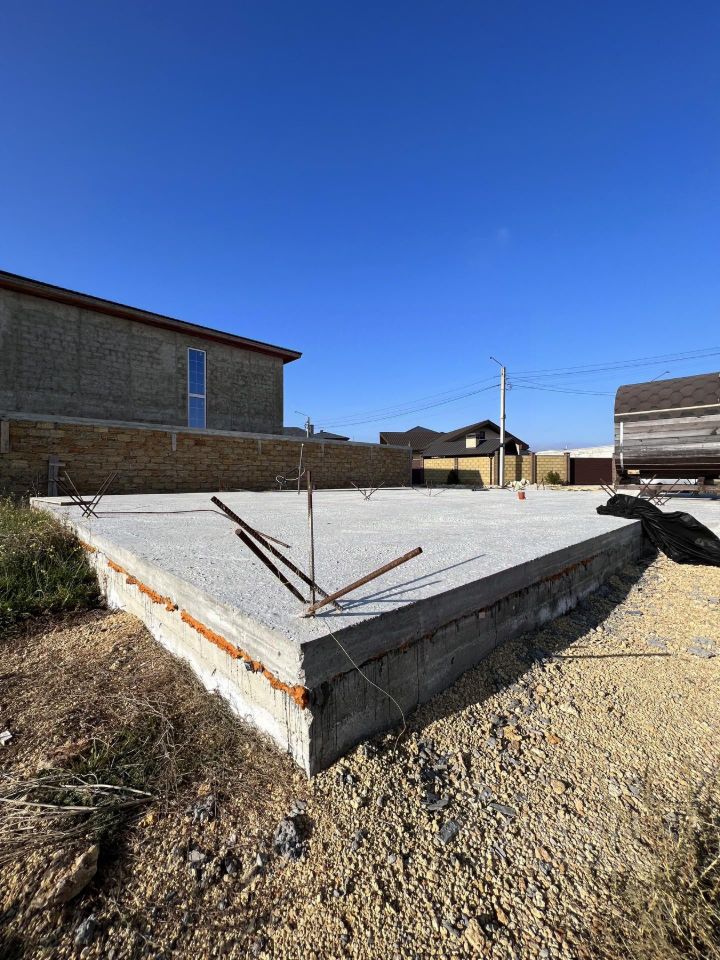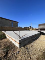 На участке залит фундамент (плита). Огорожен с двух сторон каменным забором.