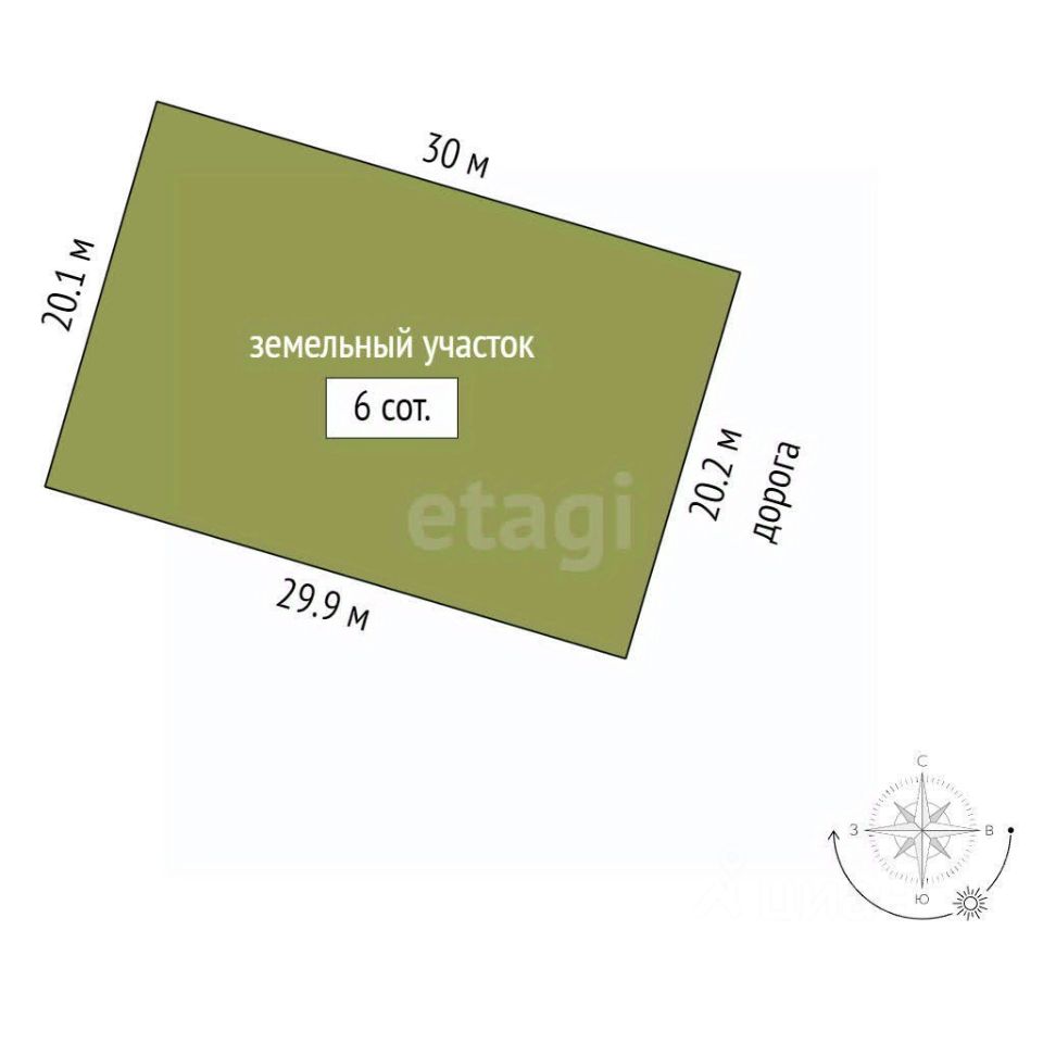 Площадь участка - 6 соток. Участок прямоугольной формы со сторонами: 20 м*30 м*20 м*30 м. Дорога - отсыпанная, в 50 м начинается асфальт и удобный выезд на объездную дорогу.