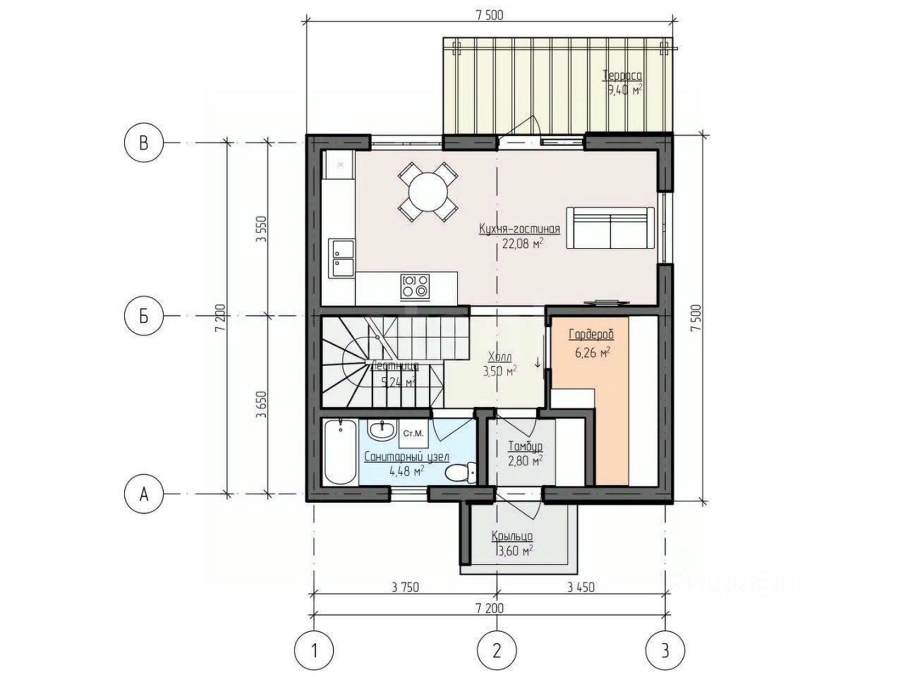 Дом площадью 125 кв.м с тремя спальнями и двумя этажами предлагает комфортное пространство для жизни. На первом этаже расположена просторная кухня-гостиная площадью 22,08 кв.м, гардеробная, тамбур, холл и санузел. Второй этаж включает три спальни (10,32 кв.м, 10,01 кв.м и 10,96 кв.м), санузел и коридор. Планировка продумана для удобного размещения семьи или работы в формате home office.