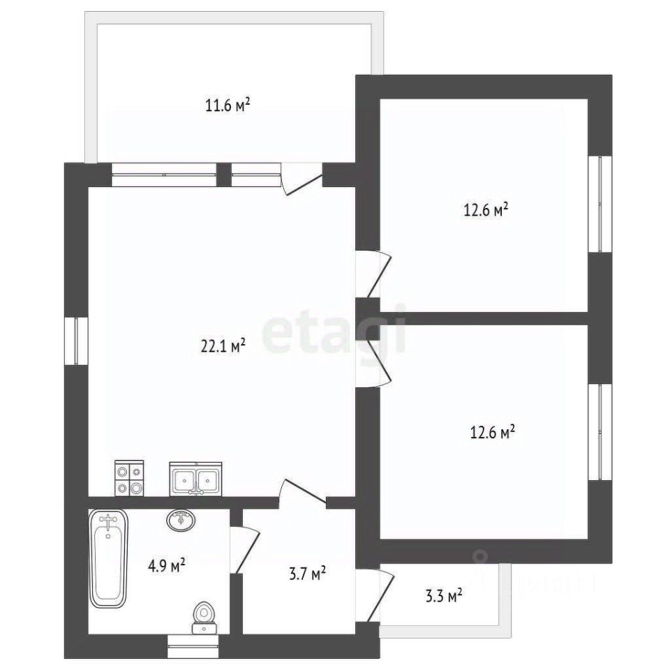 Внутренняя планировка функциональна и включает просторную кухню-гостиную, две изолированные спальни, совмещенный санузел.