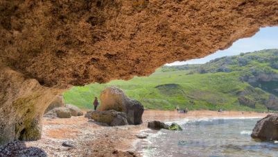 Побережье песчано-ракушечное, ровное, удивительно красивые виды на фоне гротов.